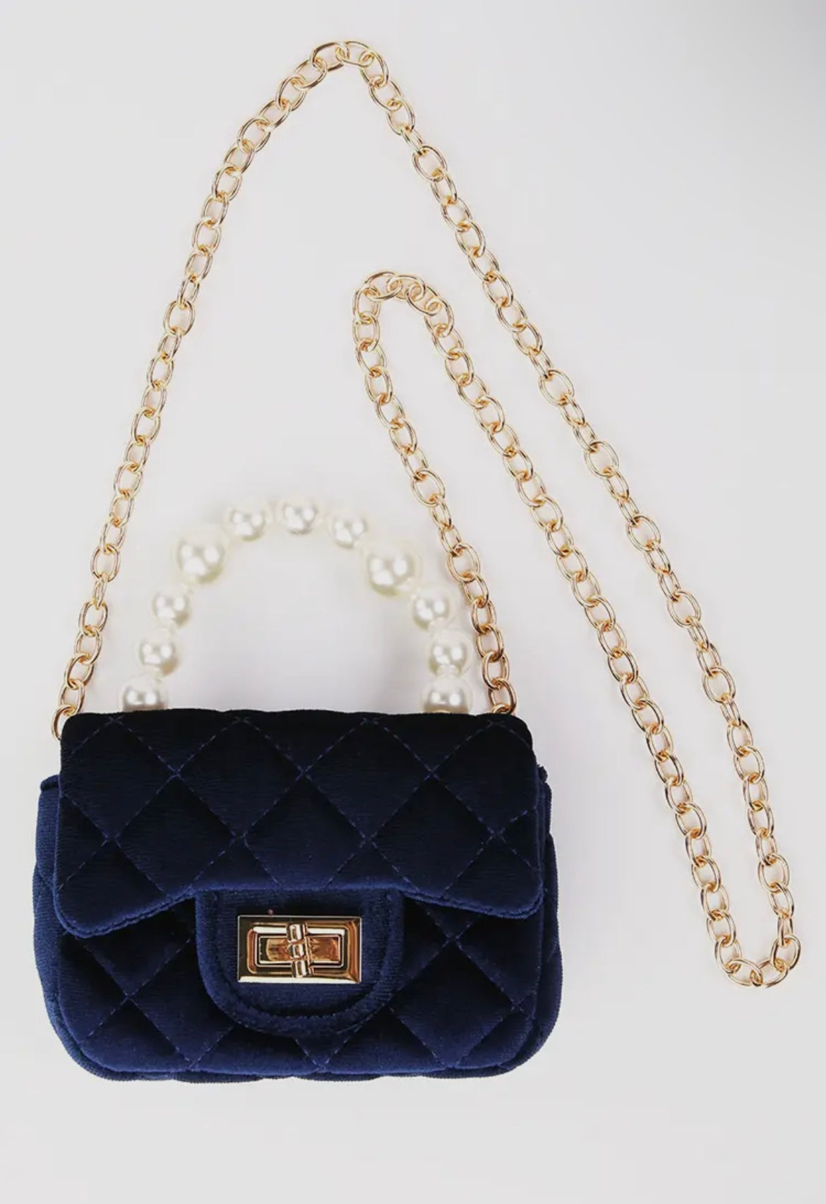 Velvet purse with pearl handle and detachable gold chain.