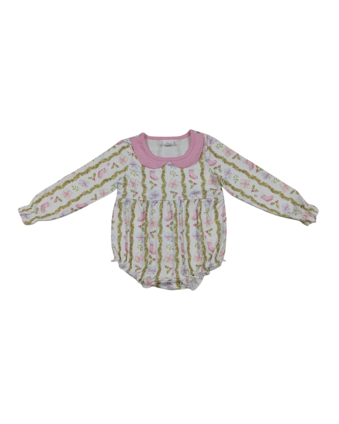 This Christmas Stockings & Gifts romper is merry, bright, and oh-so-cute. Soft and comfy for all-day play, it’s perfect for festive photos and every holiday moment!