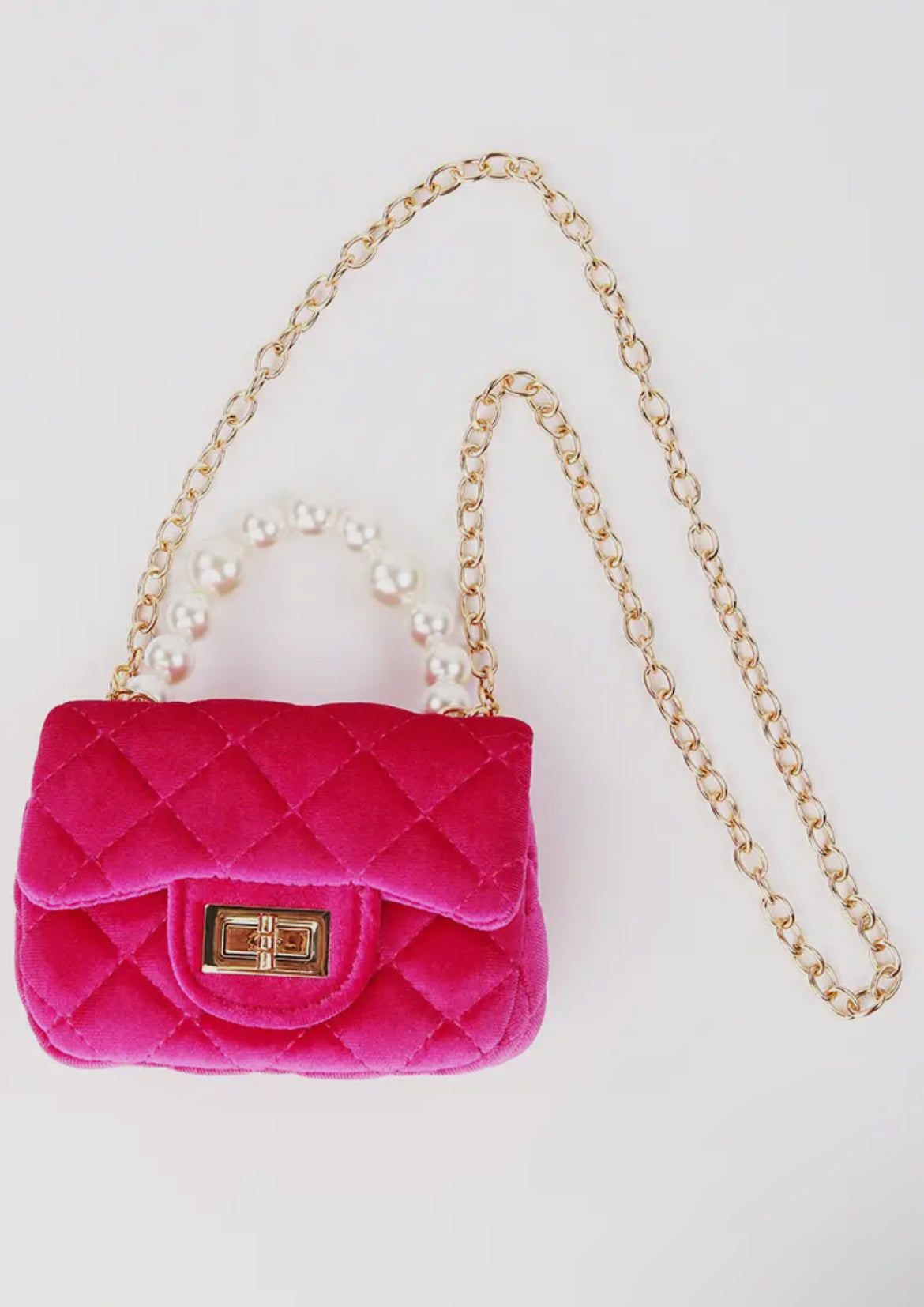 Velvet purse with pearl handle. Gold crossbody chain included.