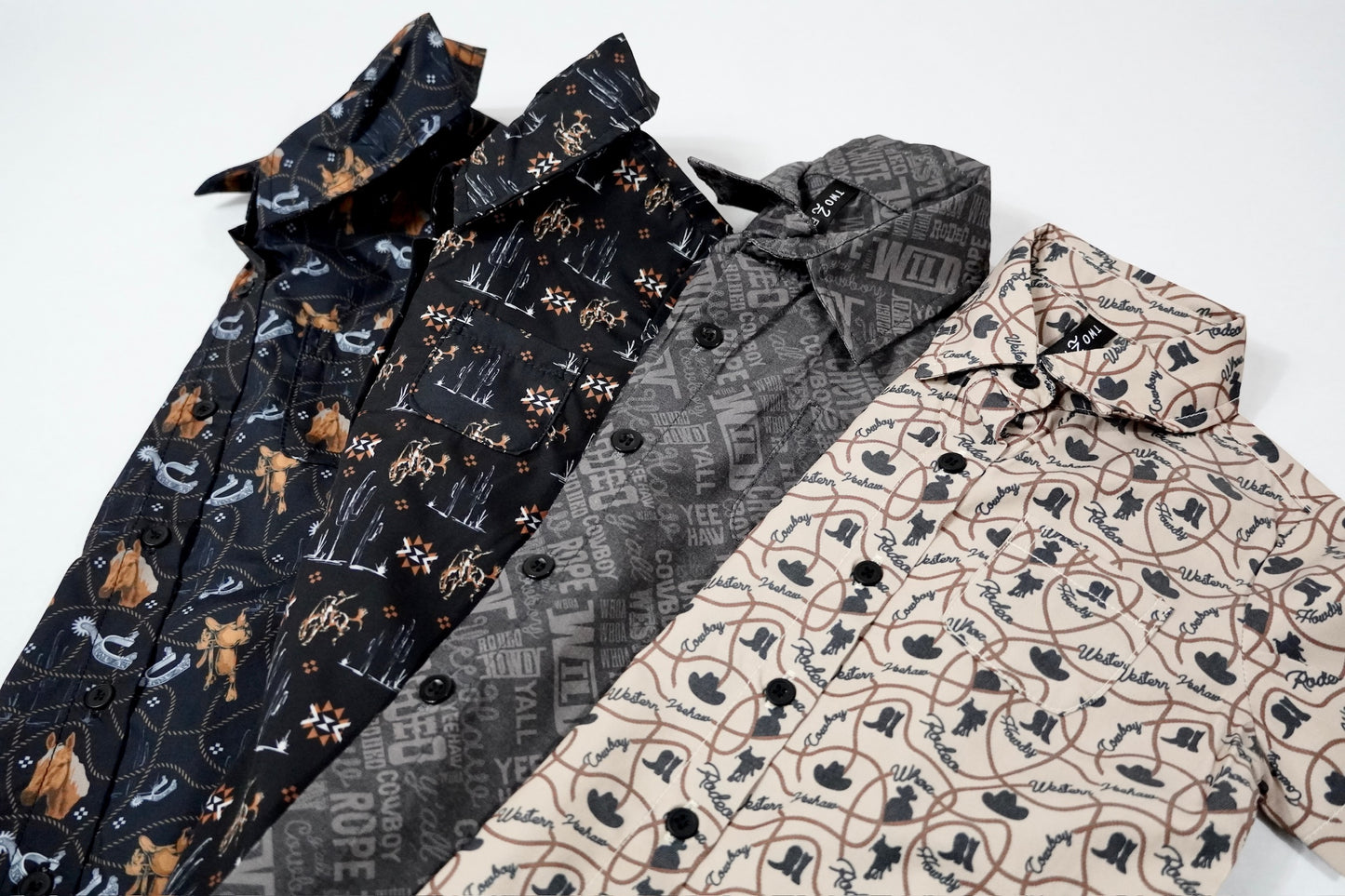 Dress your little adventurer in our Knox Short-Sleeved Button-Down Shirt, featuring a stylish dark gray hue and playful cowboy-themed prints. Perfect for casual outings, this comfortable shirt pairs well with shorts or jeans, making it a must-have for any young cowboy's wardrobe.
